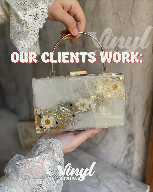 نستخدم في Vinyl Craft خامات وأدوات عالية الجودة مثل الريزن الشفاف، الأصباغ، القوالب السيليكونية، والإكسسوارات المكملة، لتمنحك أفضل نتيجة في مشاريع الإيبوكسي.